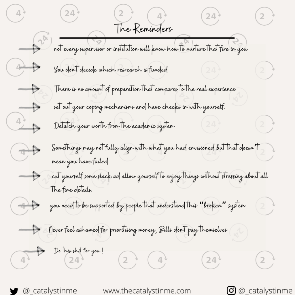 See that motivation and passion you go into something with. You are ready to put in the hours and hours of work. You are ready for the perceived challenges of academia. What you may not realise is that not every supervisor or institution will know how to nurture that fire in you. This isn’t your fault but just a fragmented piece of the broken system you happen to find yourself navigating through. Research projects aren’t always enjoyable so you’re going to have to dig real deep and remember the reasons you started this journey, put out your best work no matter what the situation is. After you’ve done good by you, you can then re-evaluate if this broken system is one worth fighting to stay in.